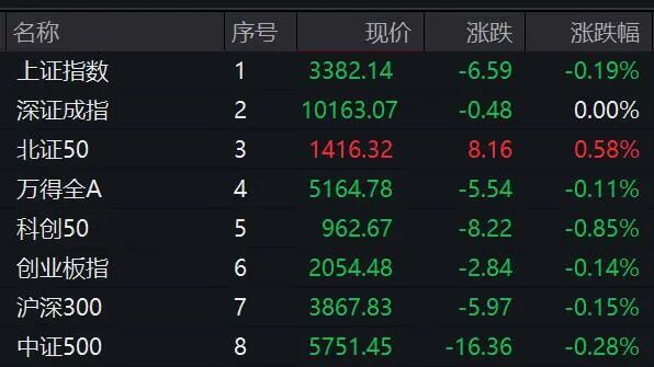 今日早盘,A股小幅震荡整理,上证指数、深证成指、科创50、创业板指等市场主要股指均小幅回落,仅北证50微幅飘红,成交呈萎缩趋势。