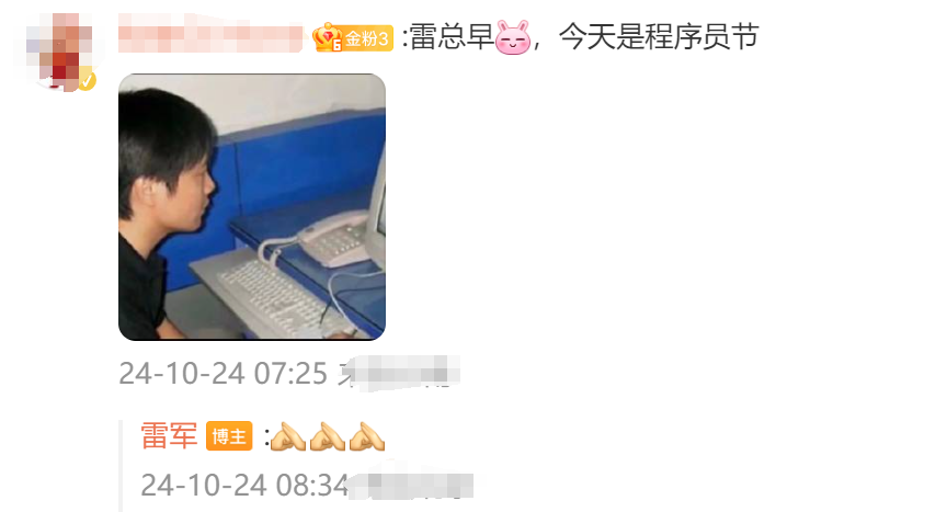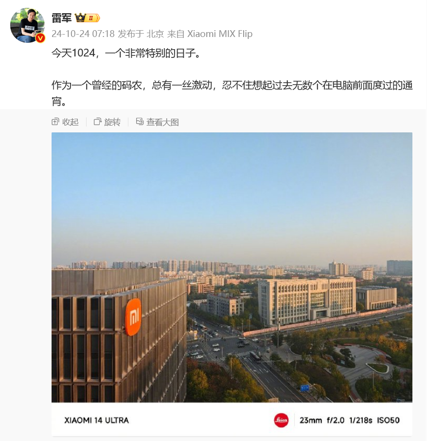 值得一提的是,2024年10月24日程序员节时,雷军还曾发文纪念。他晒出小米园区的照片并写道:“今天1024,一个非常特别的日子。作为一个曾经的码农,总有一丝激动,忍不住想起过去无数个在电脑前面度过的通宵。”