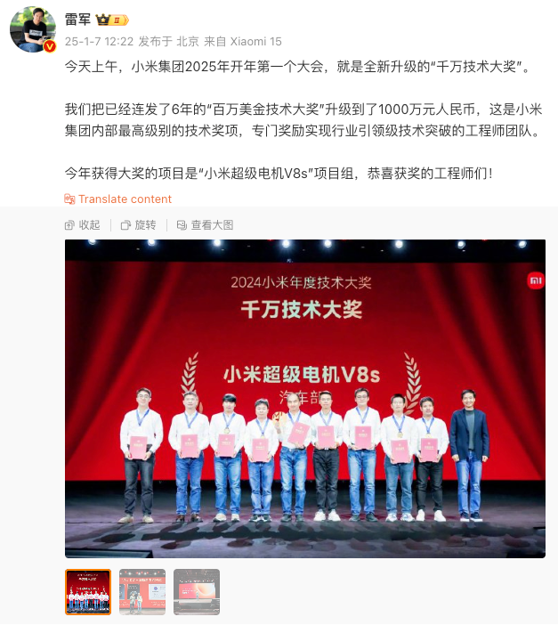 2025年1月7日,雷军在社交平台发文宣布,将已经连发了6年的“百万美金技术大奖”升级到了1000万元人民币,这是小米集团内部最高级别的技术奖项。今年获得大奖的项目是“小米超级电机V8s”项目组。